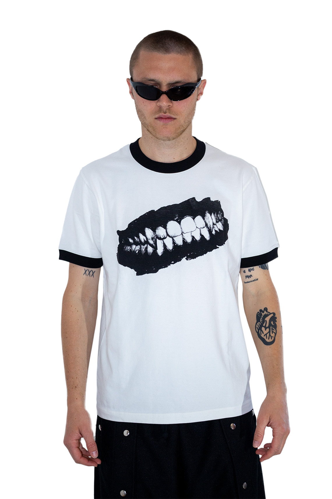 Vampire Teeth Artwork At Front. Tight Fitting Heavy-Cotton Ringer T-Shirt. Screen Print Made In Germany. 100% Cotton.